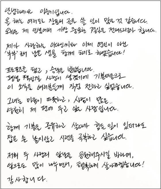 지난 2월 7일 화요일, 이승기는 자신의 공식 인스타그램 개정(@leeseunggi.official)을 통해 결혼 발표 전문을 올렸습니다. 중대발표이니만큼 정성스럽게 직접 수기로 작성하였네요.
