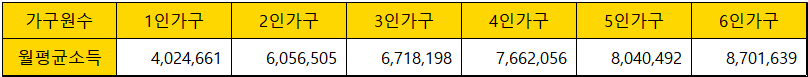 2순위는 본인과 부모님의 소득과 자산이 기준을 충족하는지 여부를 확인합니다. 소득은 월평균 소득이 지난년도 도시근로자 월평균 소득의 100% 이하여야 합니다. 아래 표는 22년도 도시근로자 가구당 월평균소득 100% 금액입니다.